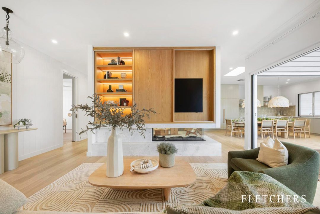 Light-filled interiors with soaring gabled ceilings, feature skylights, beautiful timber floors, and a fresh palette create a serene ambience that elevates the expansive open-plan living area, where a striking central fireplace promises cosy winter nights. The sleek designer kitchen is fully equipped with stone benches, quality appliances, and abundant storage, while a servery window opening to the deck is perfect for poolside brunch.